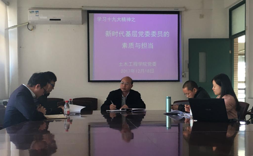 12月18日上午,土木工程学院在综合教学楼群C5-406召开了以“新时代基层党委委员的素质与担当”为主题的学习十九大精神党委会。会议由学院党委书记张灯主持。