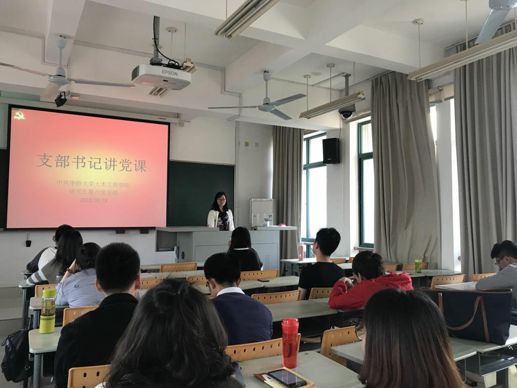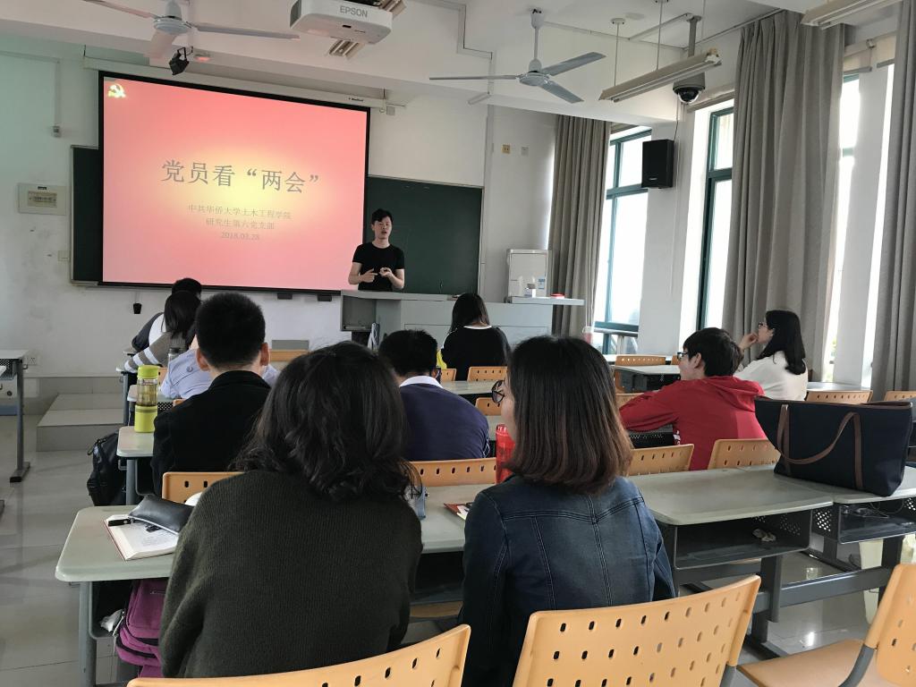 2018年3年28日下午4:30,土木工程学院研究生第六党支部在综合教学楼D2-504开展本学期第一次全体党员大会暨学习“两会”精神专题党课。会议由党支部书记唐玲玲同志主持。