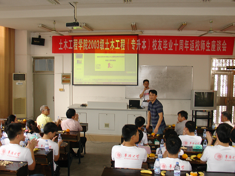 24日上午,在泉州校区土木楼二楼梯形多媒体教室举行的2003级土木工程(专升本)毕业十周年师生座谈会时,郭子雄向校友汇报了土木工程学院在学科建设、人才培养、科研服务等方面取得的成绩和发展现况。教务处处长曾志兴,土木工程学院施养杭、王仁谦、方德平、退休教师林雨生、涂帆等以及班主任陈秀峰参加校友座谈。